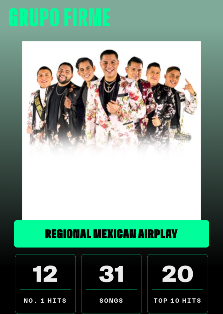 Grupo Firme has had 31 hits on Billboard’s Regional Mexican Airplay chart, of which 20 have reached the top ten and 12 have reached number one.