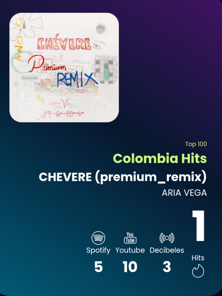 “Chevere (premium Remix)” by Aria Vega and Ryan Castro remains at the top of the list of the 100 most popular songs in Colombia. The song is in the Top 10 across all three metrics used to compile the chart: Radio, YouTube, and Spotify.