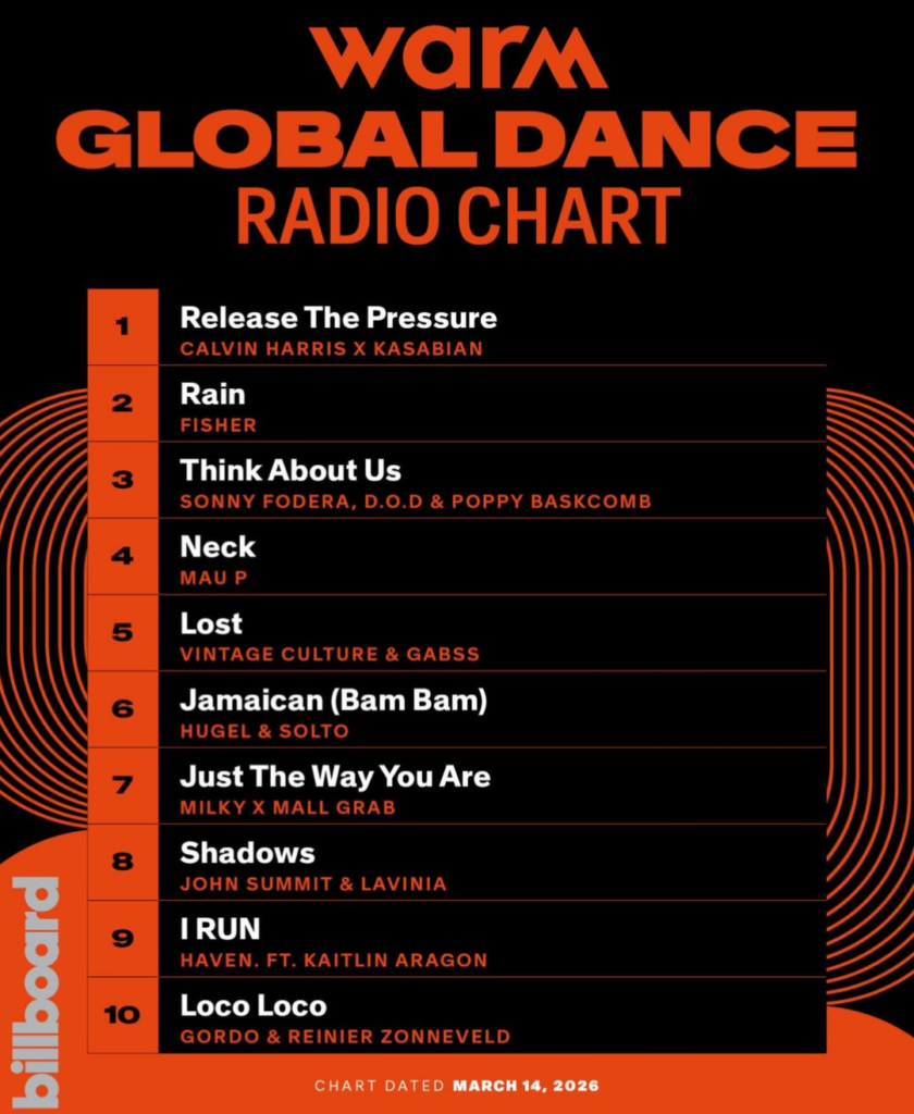 This chart, produced in partnership with Warm (World Airplay Radio Monitor), tracks over 200 dance radio stations in 30 countries.