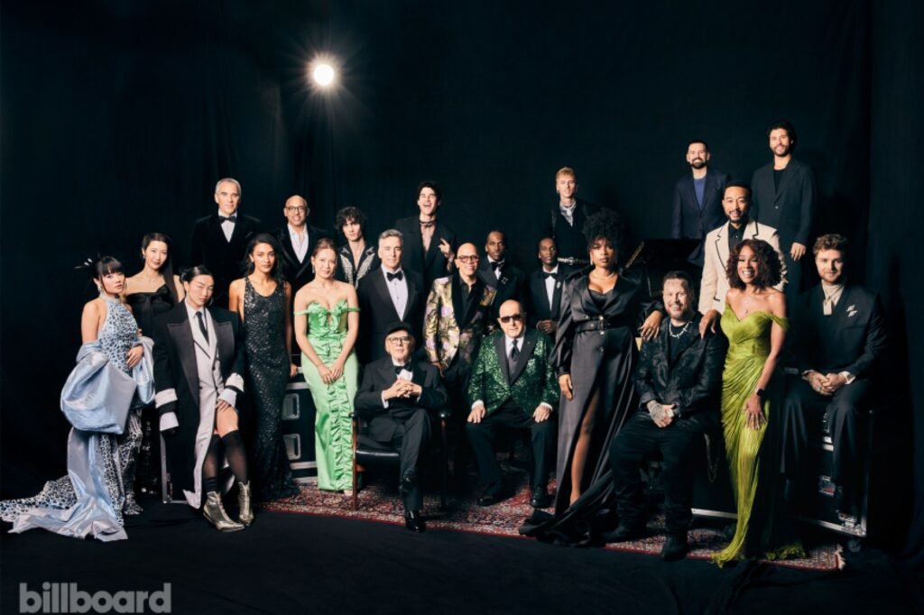 The 2026 Grammy party class photo, taken Jan. 31 at The Beverly Hilton in Los Angeles. Back row, from left: Monte Lipman, Harvey Mason Jr., Sombr, Darren Criss, Pusha T, Malice, Machine Gun Kelly, Shay Mooney, John Legend, Dan Smyers. Front row, from left: Rei Ami, EJAE, Audrey Nuna, Olivia Dean, Laufey, Avery Lipman, Art Garfunkel, Rickey Minor, Clive Davis, Jennifer Hudson, Jelly Roll, Gayle King, Alex Warren.